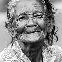 In Indonesie stond dit oude vrouwtje, van nog geen 1,30 meter langs de kant van de weg, ze durfde niet over te steken. Ik bood haar mijn hand aan en stak met haar over, ze heeft mijn hand daarna niet meer losgelaten. We hebben zo een paar minuten dezelfde richting opgelopen, hand in hand, ze bleef maar naar me lachen met die paar tanden die ze nog had. Ik vroeg haar hoe oud ze was, 100 zei ze en toen lachte ze nog harder.