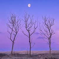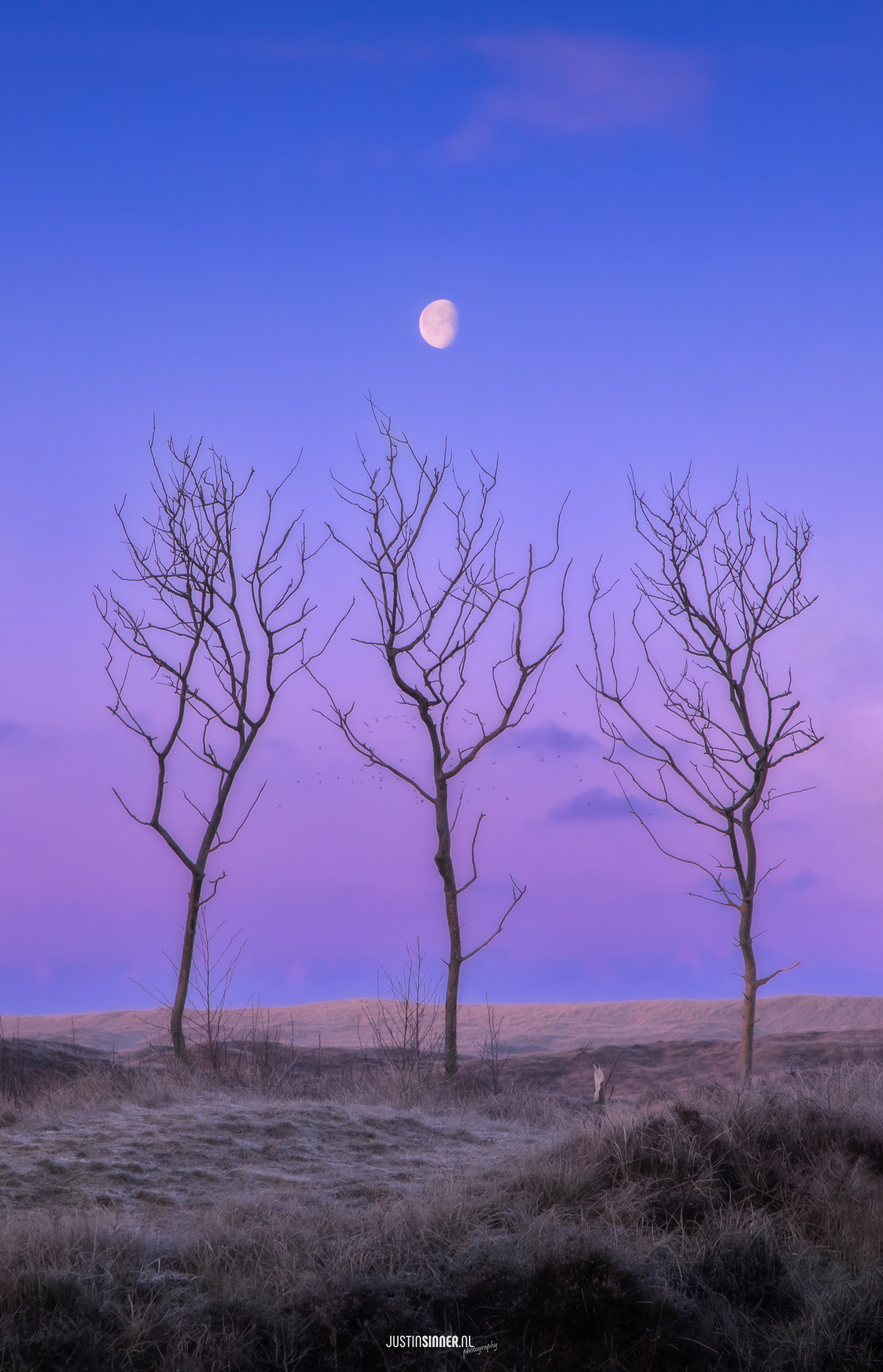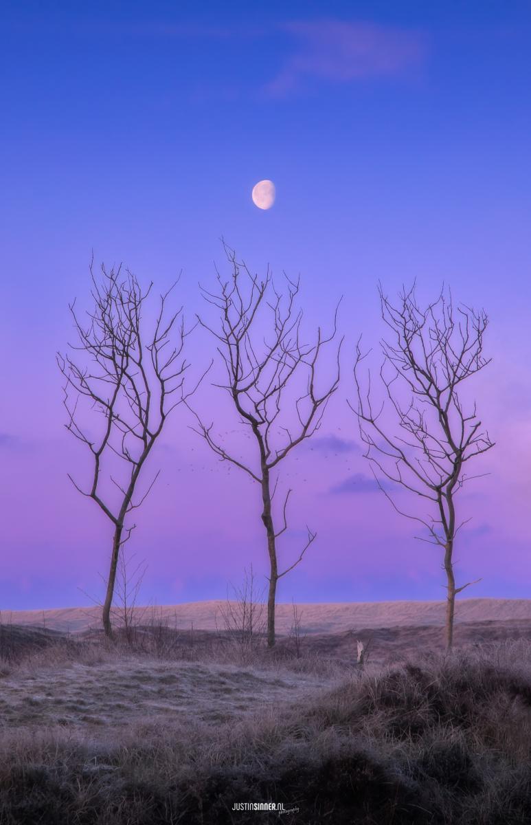 3 bomen in de duinen van Texel vlak voor zonsopkomst. De maan staat precies in het midden en het was een koude ijzige ochtend op Texel. Ik had het idee al een tijdje, de maan stond nu precies goed.