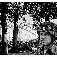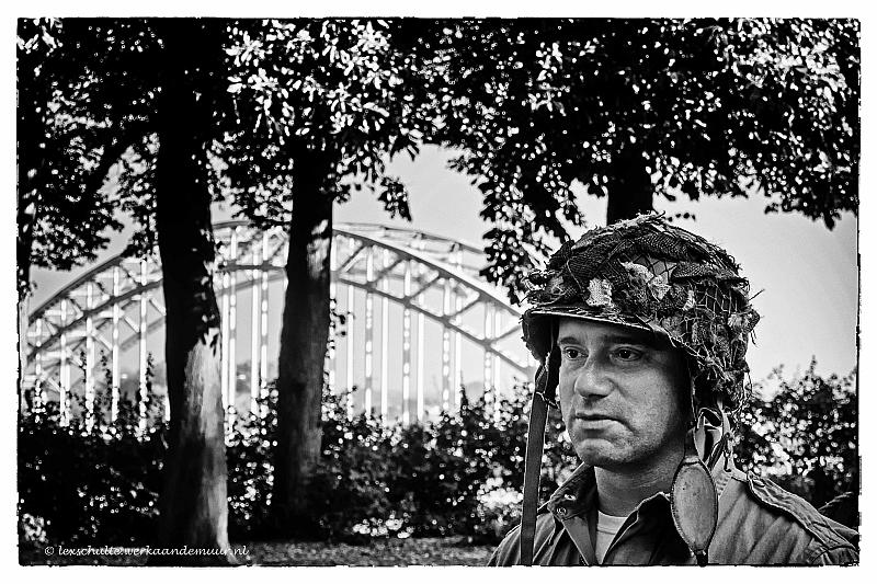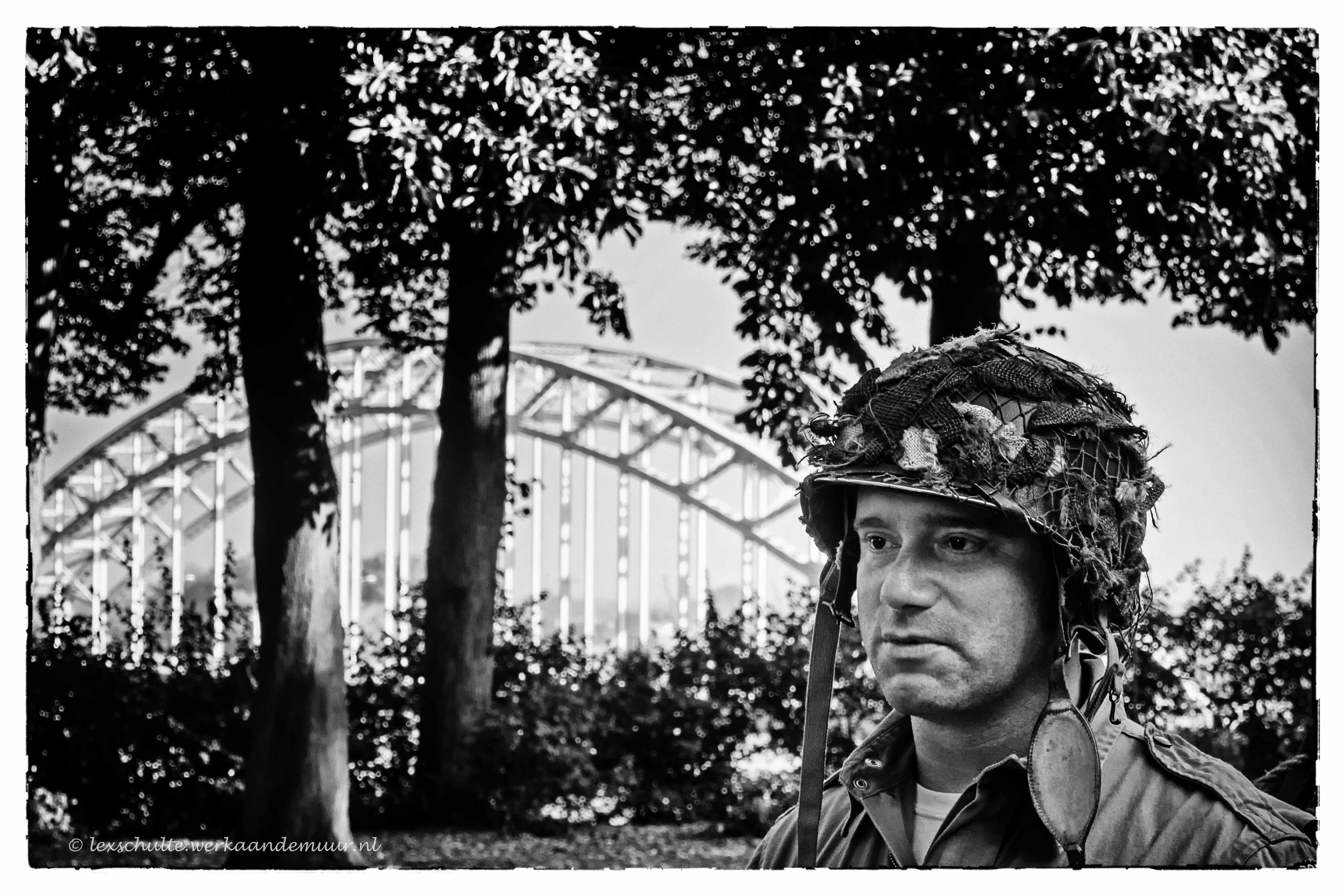 70 jaar Market Garden. Deze mensen hebben een Amerikaans legerkamp nagebouwd om aan kinderen te laten zien hoe het er 70 jaar geleden uitzag. Op de achtergrond de Waalbrug, één van de doelen van operatie Market Garden.