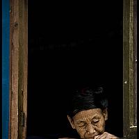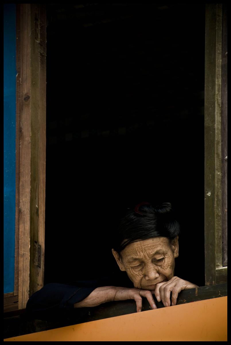 Vlak voordat we bij Zhaoxing aankwamen, bezochten we het pittoreske Dong-dorpje Jitang. Het was een genot door de kleine smalle straatjes te lopen en om hoekjes te turen. De sfeer van de kleine houten chaletjes leek soms op een bergdoprje in de Alpen, en soms deed het ons denken aan een Amerikaanse Western. In het centrum van het dorp was een klein marktje waar vis werd verkocht. Dit mooie vrouwtje tuurde een beetje schuw vanuit haar hoge raam naar de drukke bezigheden van haar dorpsgenoten. Af en toe werd zij gegroet, maar de meesten merkte haar niet op en dat leek zij maar beter te vinden.