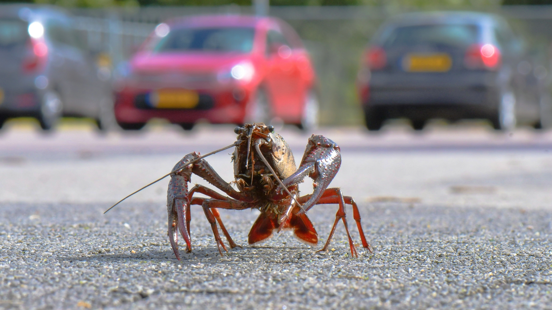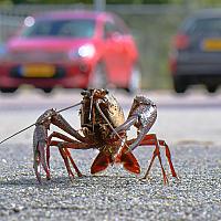 Rode Amerikaanse Rivierkreeft aan de andel gewoon op de parkeerplaats van de voetbalvereniging DVV te Duiven