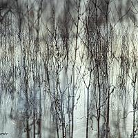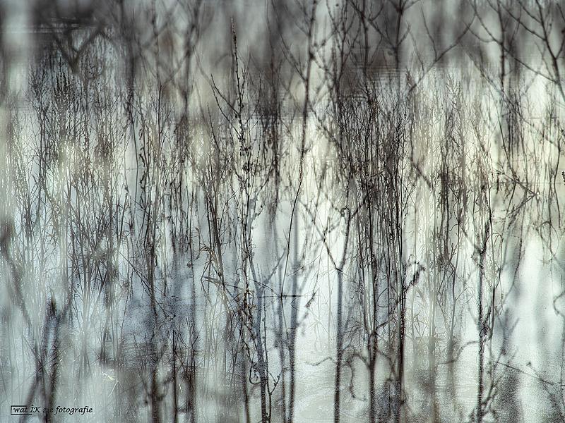 Een beeld dat iets boven water, iets onder water, lucht, spiegeling, takjes en beweging laat zien. Gedaan met meervoudige belichting en beweging, en dat samengevoegd en een foto.