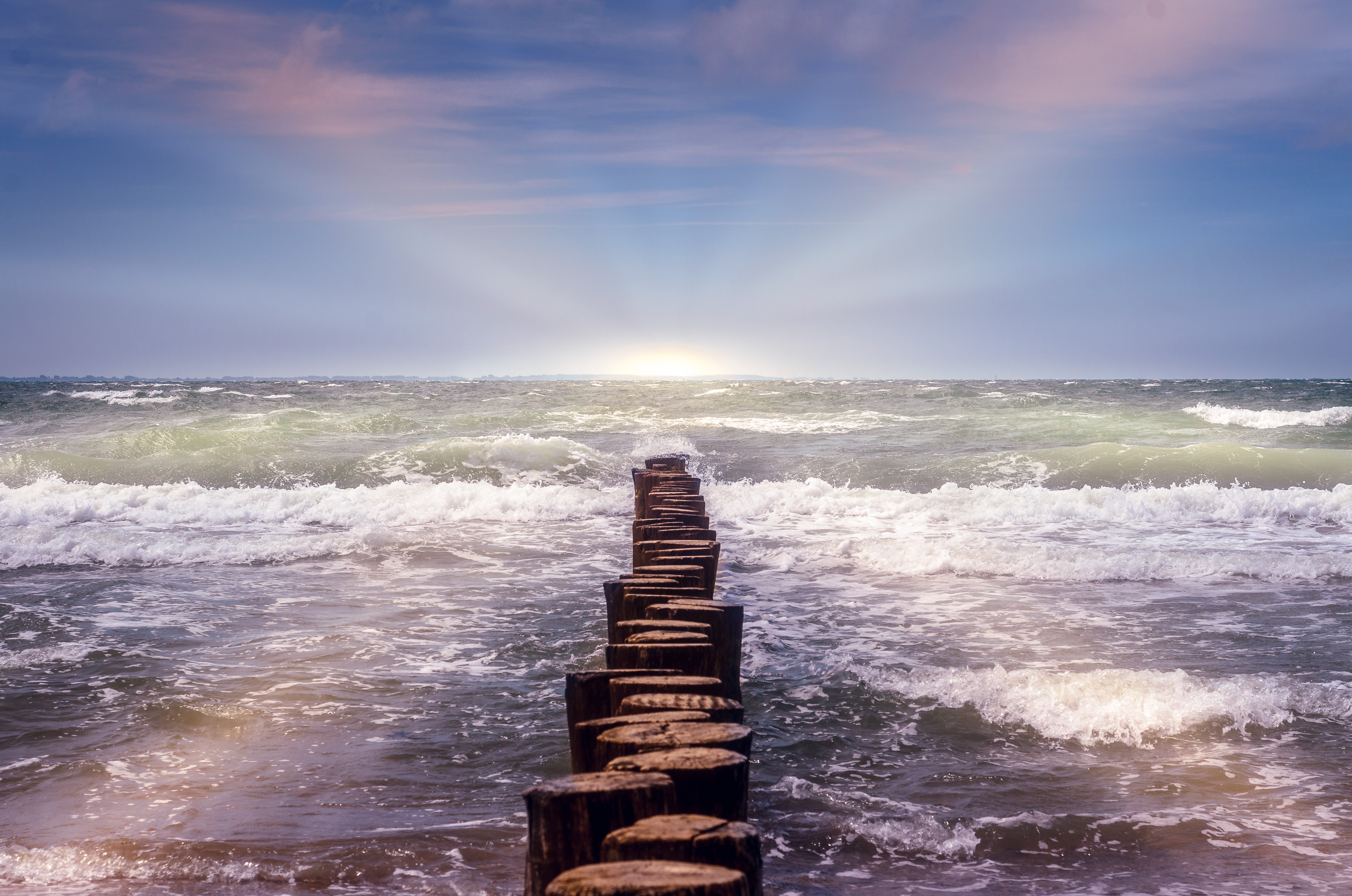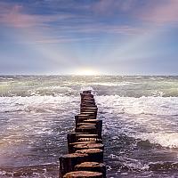 Een westenwind stuwt het water op en de golven slaan tegen de palenrij, die in woelige zee verdwijnt in de richting van het licht....... achter de horizon.