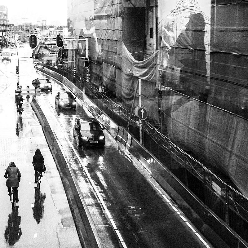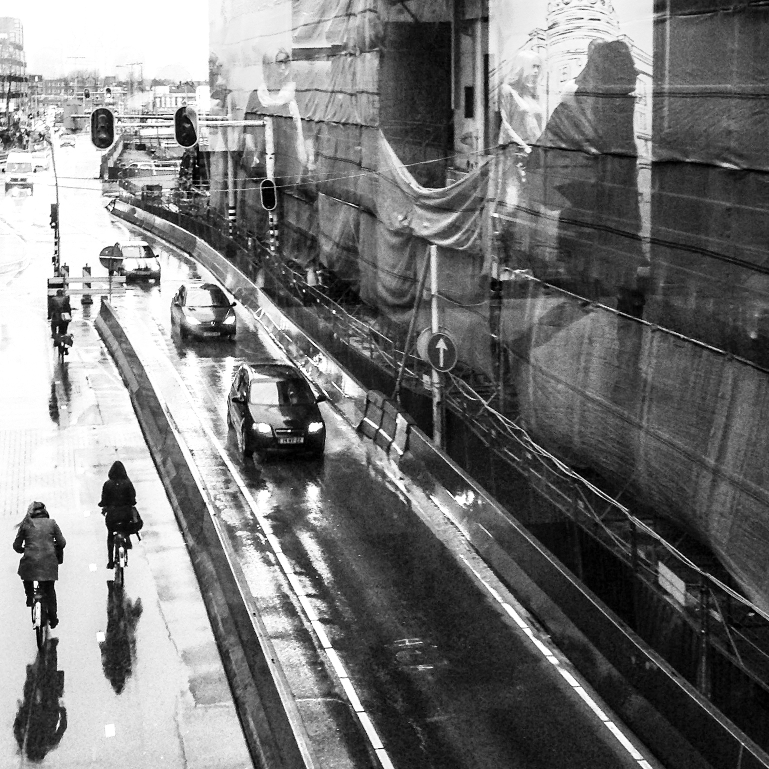 weerspiegeljng van fietsers in de regen en en weerspiegeling van reizigers in de ramen