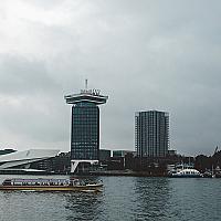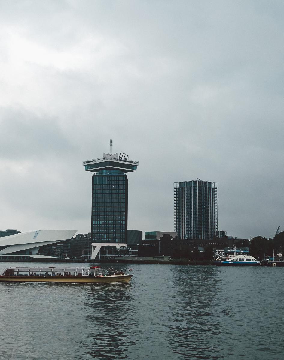 De A'dam toren en B'mine aan de noordzijde van het IJ, gefotografeerd vanaf het Centraal Station