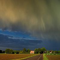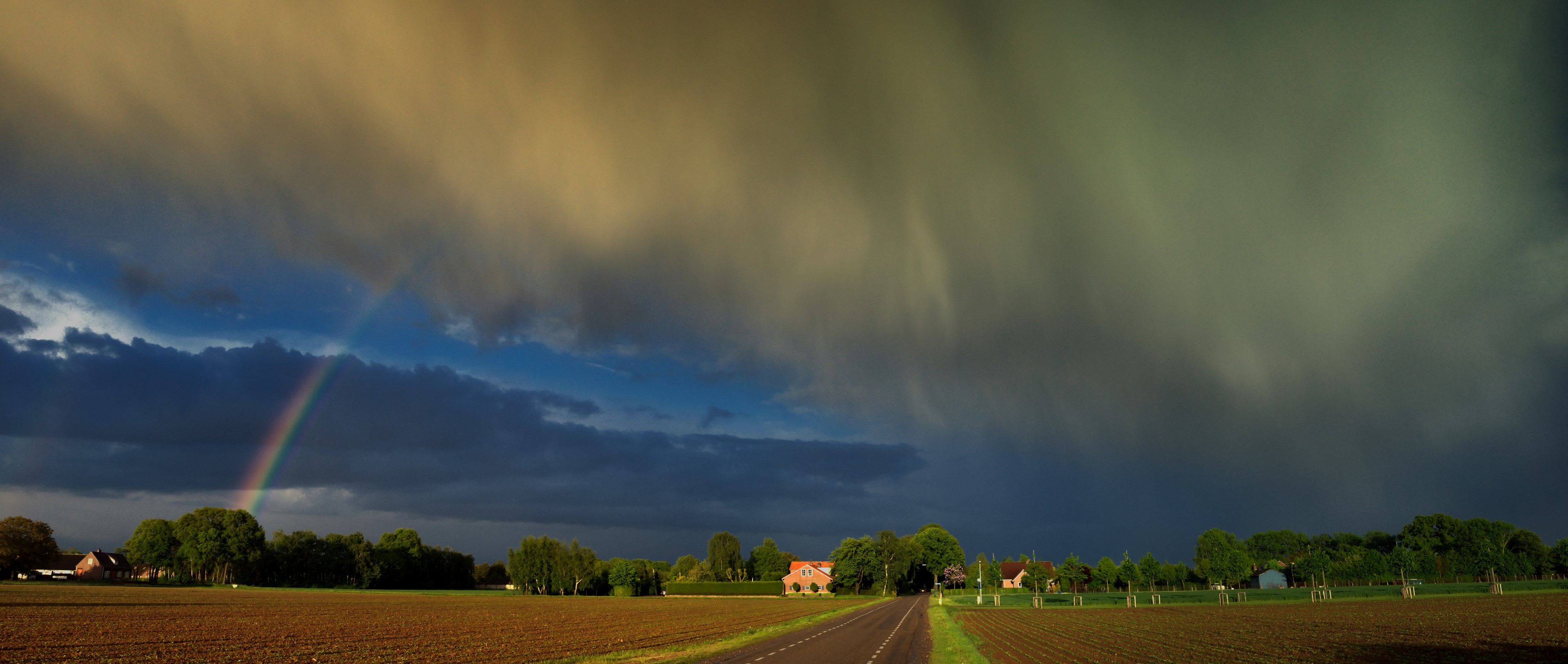 Een panorama foto van een opklaring na een bui. Dit panorama is samengesteld uit acht afzonderlijke foto's om zowel de opklaring, met regenboog, als de bui in één beeld te krijgen.