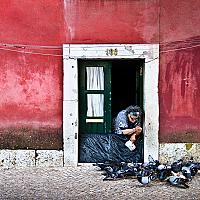 Een oude vrouw voert de duiven in de oudste wijk van Lissabon: Alfama