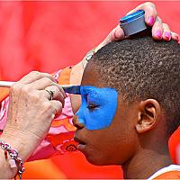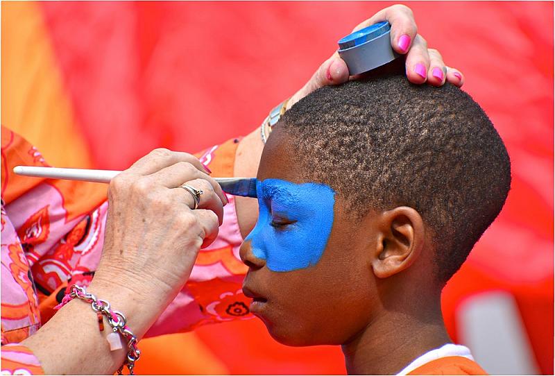Deze jongen moest alleen nog even schminken en daarna kon hij meedoen aan het Koningsfeest in Leeuwarden.