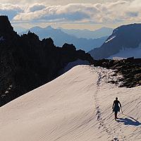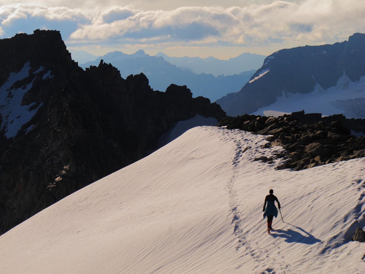 Regien Winnubst loopt terug naar het kamp na een vroege beklimming van de Piz Tschierva (3546 meter).