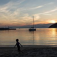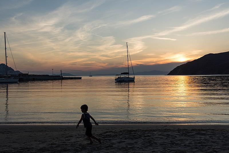 Een mooie zonsondergang in de haven van Aegiali. Het bootje en spelende kindje tegen een achtergrond van zee en bergen roepen een instant vakantiegevoel op.