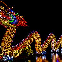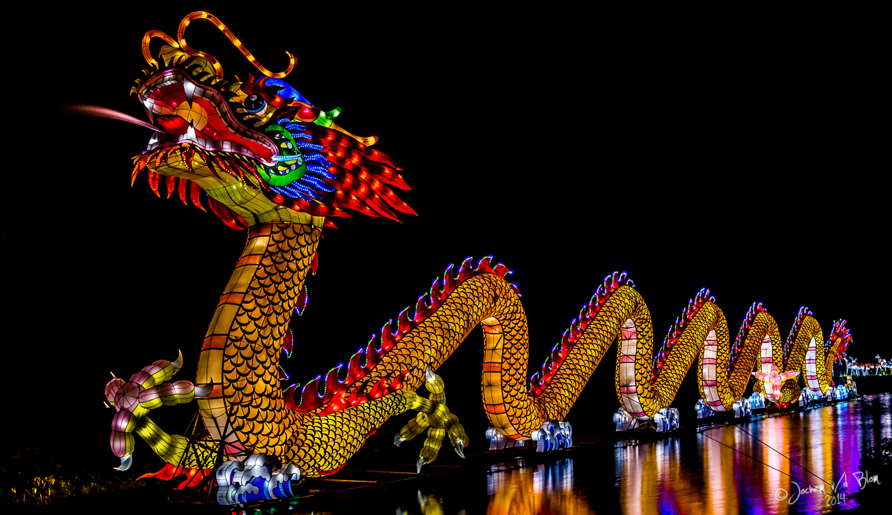 Geschoten op China Light Festival. Helaas stak de wind op deze avond wat een mooie weerspiegeling in het water niet ten goede kwam. De foto zal niet heel origineel zijn aangezien er maar een hoek is waarop je de draak er volledig op krijgt. Een goede nabewerking kan daarom dus onderscheidend zijn voor het slagen van de foto.