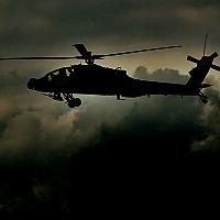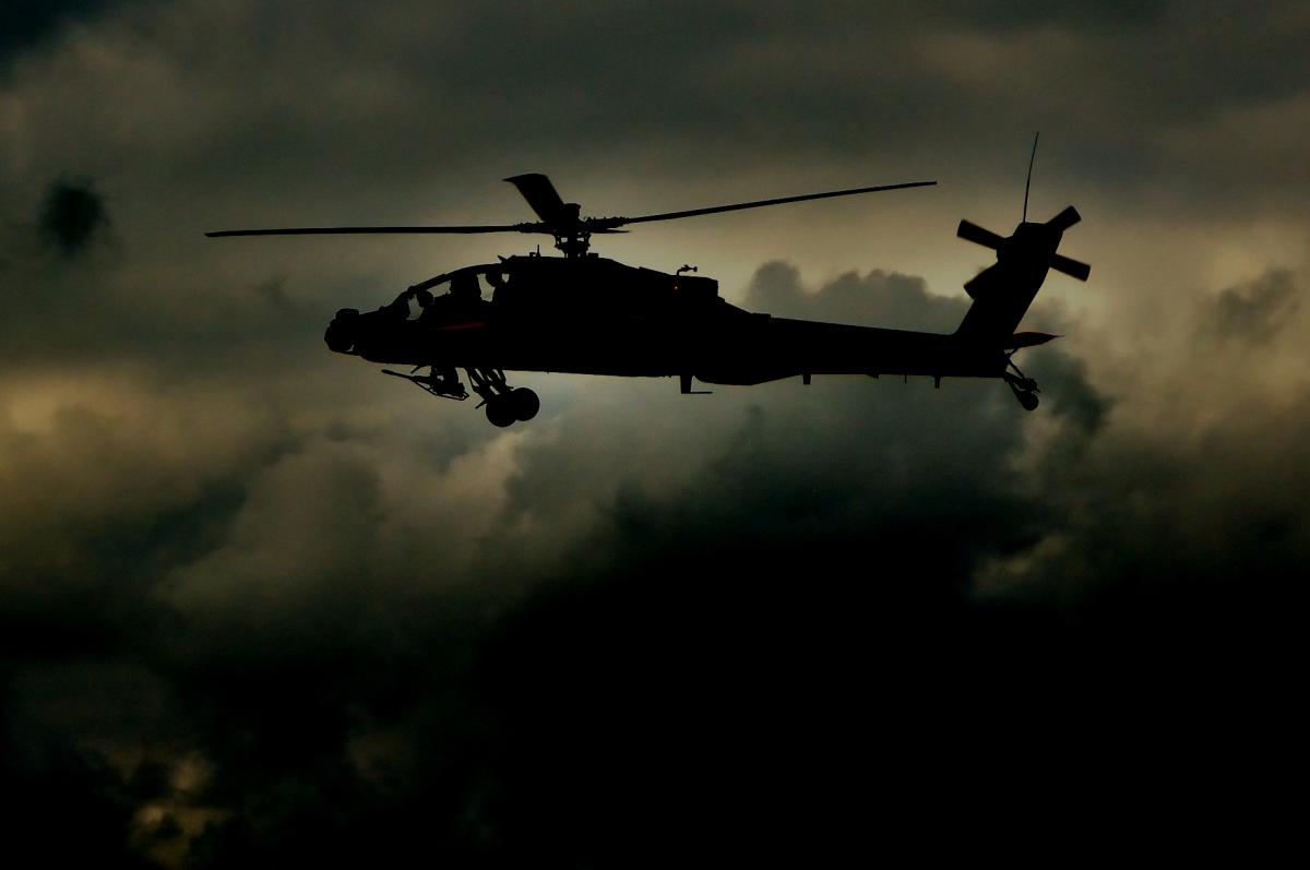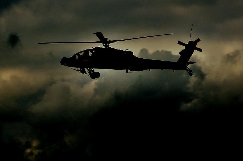 Foto is overdag genomen tijdens een demo, maar nabewerkt zodat het lijkt alsof de Apache 's nachts op patrouille is.