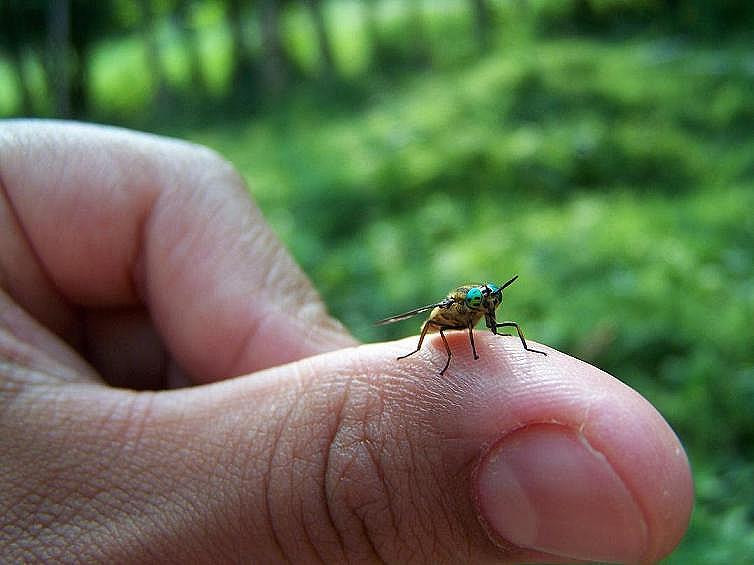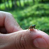Ik was in het bos aan het wandelen en foto`s aan het maken tot er plots op mijn duim deze aparte vlieg ging landen, aan een kant was ik bang dat hij me zou steken want zo iets heb ik nooit gezien dus in alle haast maakte ik deze foto en hoopte dat hij goed zou zijn dus klikte ik er paar keer, en deze laat heel goed zien dat hij heel scherp is samen met mijn duim en de achtergrond is heel diep en onscherp, ondanks dat die vlieg ook groen is en de achter grond ook groen is hij als nog scherp en goed te zien,