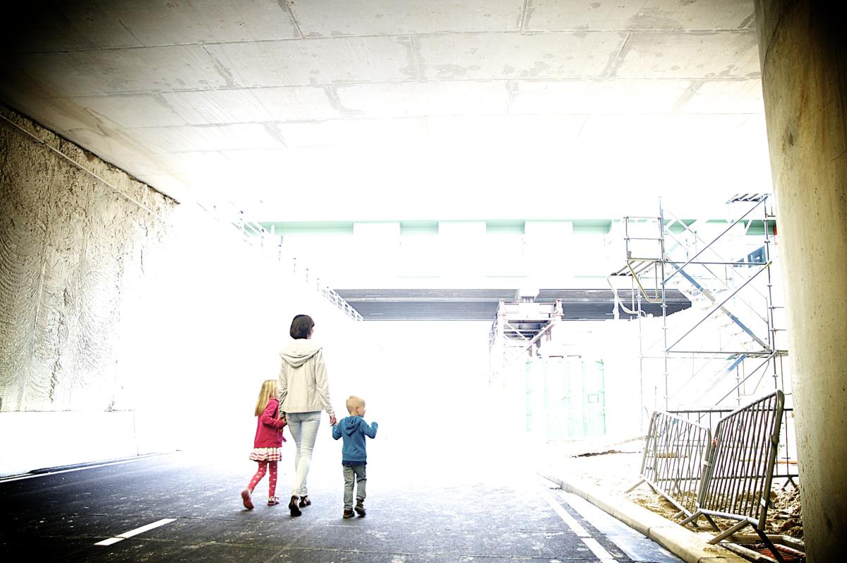 De foto is genomen tijdens de bouw van de Hondsrugtunnel. De personen op de foto nemen alvast een kijkje in de toekomst....
