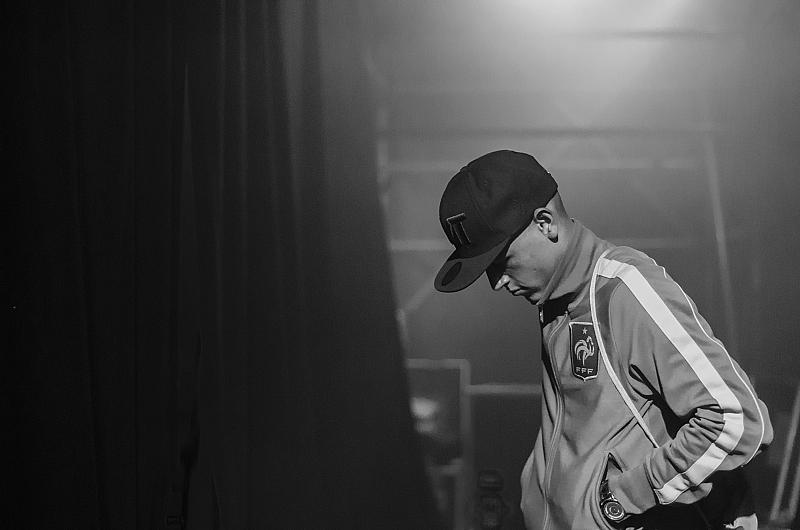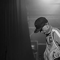 Een zwart wit foto waarin te merken is hoe een dj zich mentaal voorbereid net voordat hij moet gaan optreden.