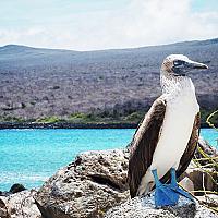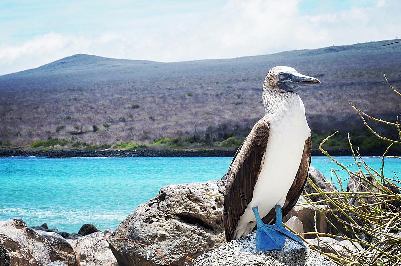 Een Jan van Gent op de Galápagos-eilanden poseerde prachtig met zijn blauwe pootjes voor de even zo blauwe zee.
