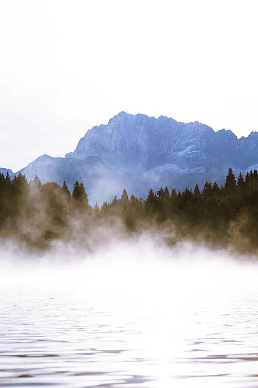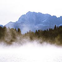 Foto van nevel boven het oppervlak van de Geroldsee (ook wel bekend als Wagenbruchsee) tijdens zonsopgang in de herfst van 2023 in Beieren, Zuid-Duitsland.