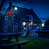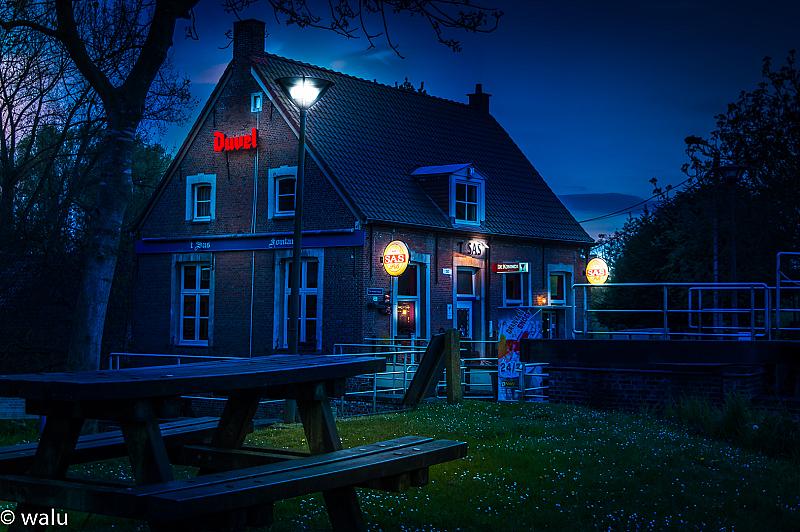 Foto genomen bij zonsondergang. Kleuraanpassing blauw. Verlichting en reclameborden extra verlicht.
