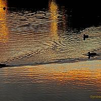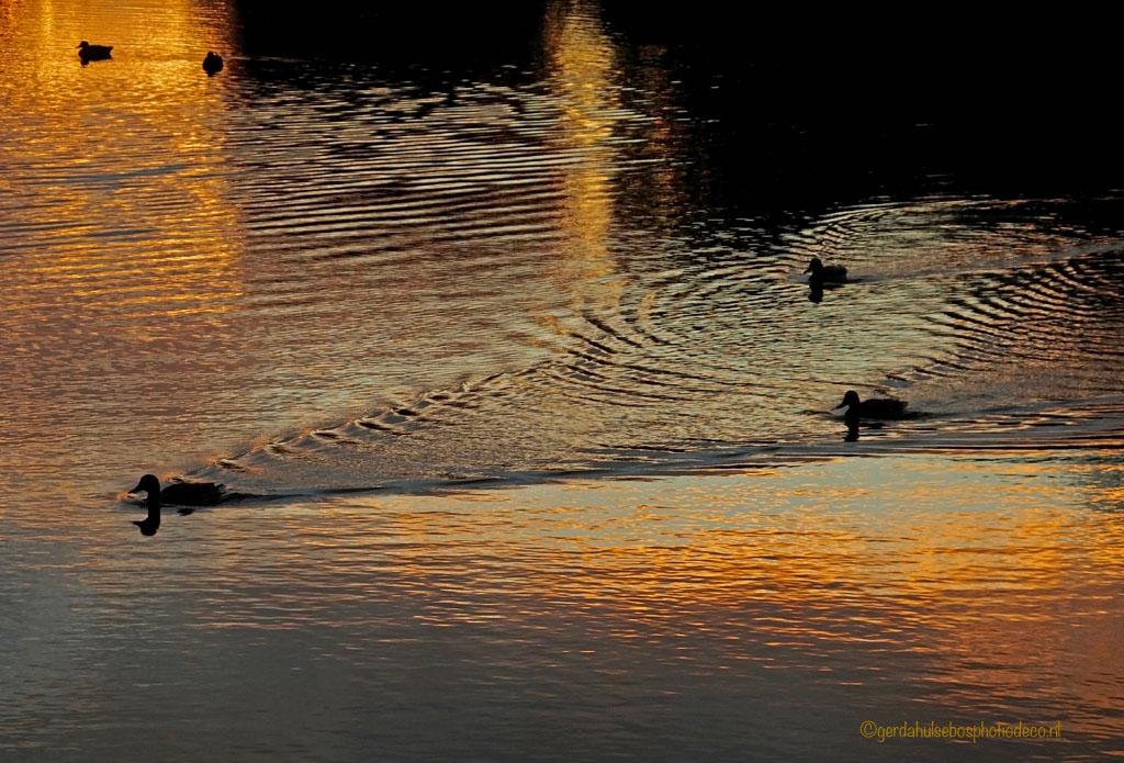 Een wandeling rond het meer met een mooie zonsondergang eindigde in het spoor van van eenden die om een korstje brood naar ons toe zwommen.
