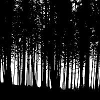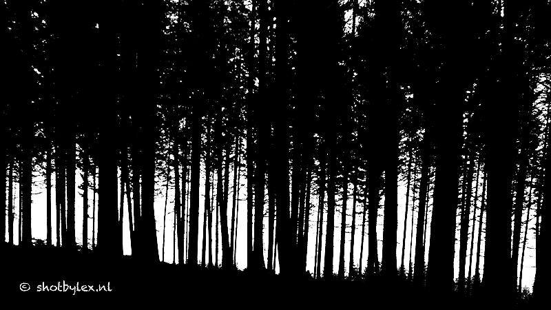 Het lijkt wel een streepjescode... Tegenlicht van een bomenrij op een heuvel.
