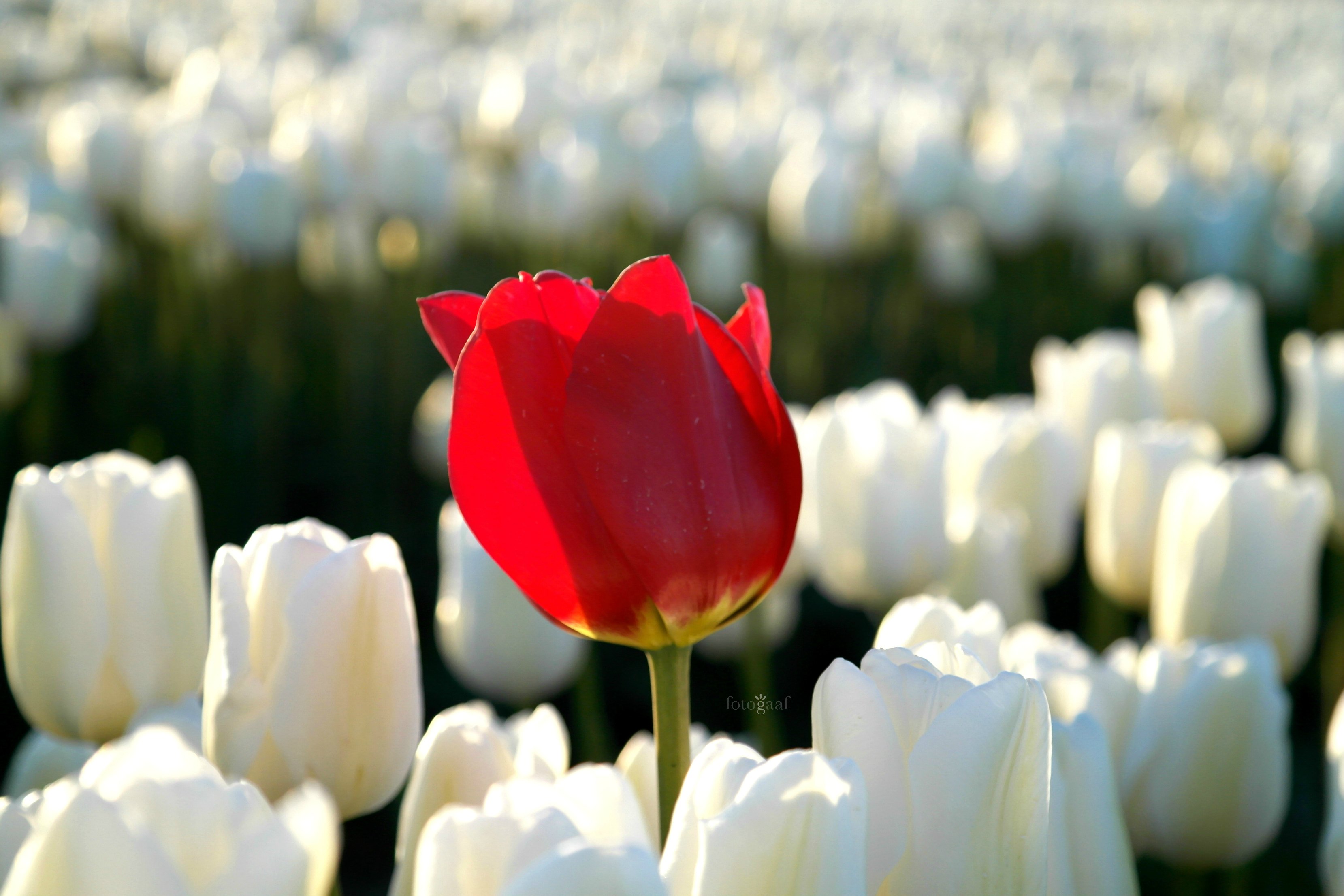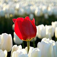 Daar sta je dan, als rode tulp geboren tussen alleen maar witte tulpen. Wees jezelf en leef je leven.