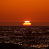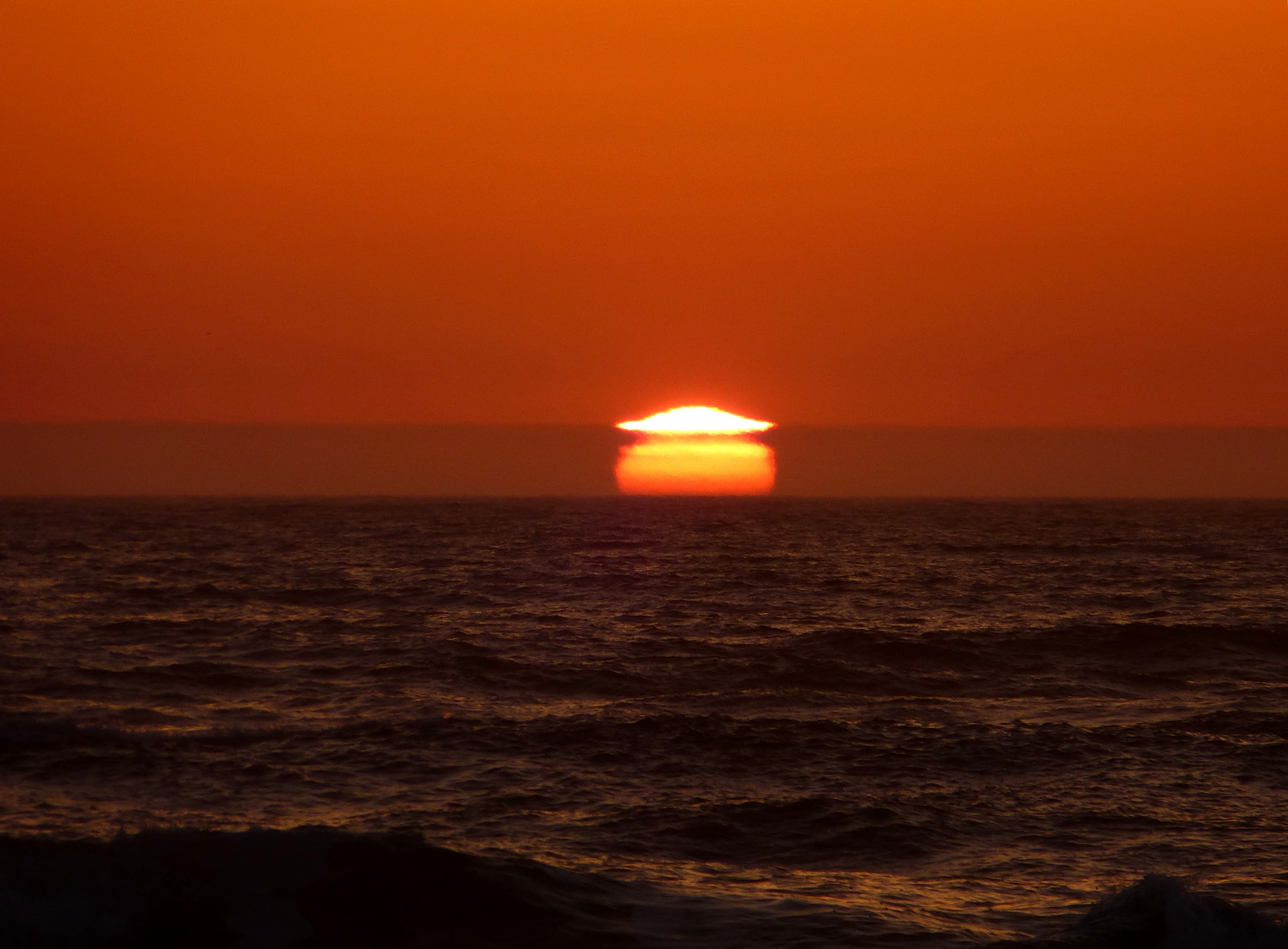 Net voordat de zon verdwijnt aan de horizon weerkaatst de zon prachtig in het water met een bijzondere vorm