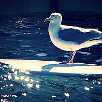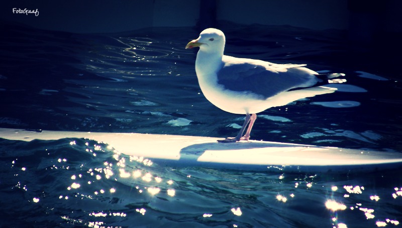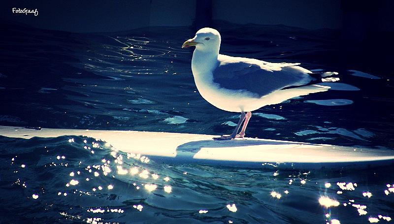 Een echte beachmeeuw, zie 'm gaan op zijn surfplank...! :)
