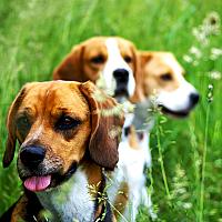 Onze beagles janna, Bram en Femke rusten uit in het hoge gras na een jachtproef
