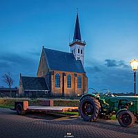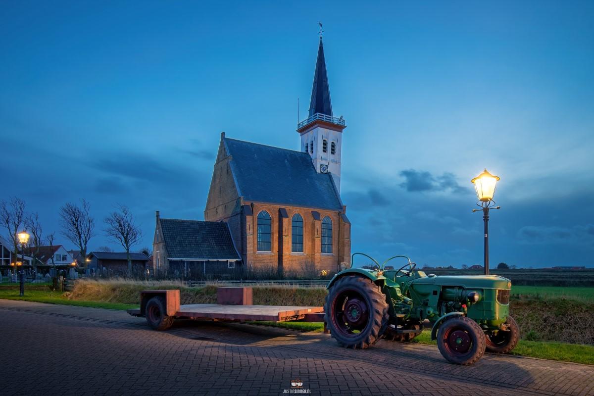 Kerk van Den Hoorn op Texel met een oude Deutz tractor.