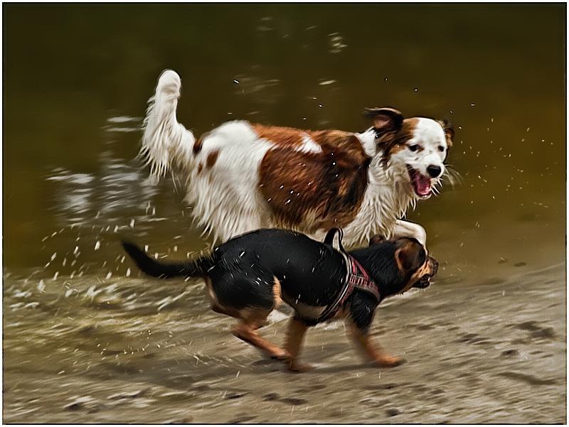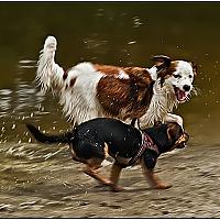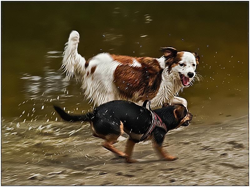 Mijn hondje Amy (in de voorgrond) heerlijk aan het spelen bij een meertje met een onbekende hond tijdens een wandel uitstapje.