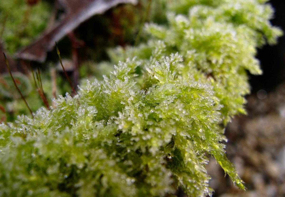 mos langs de rand van een bloempot, met allemaal kleine ijskristalletjes eraan.