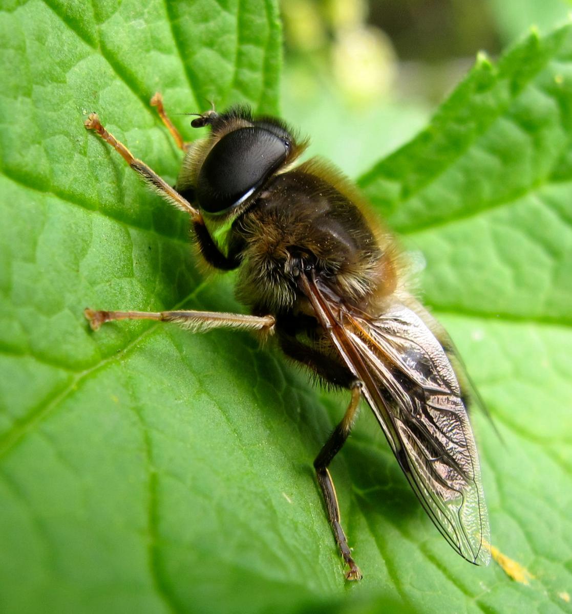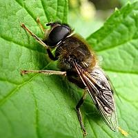 Eeen bij op het blad van een rode bessenstruik, heerlijk te genieten van de zon.
