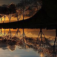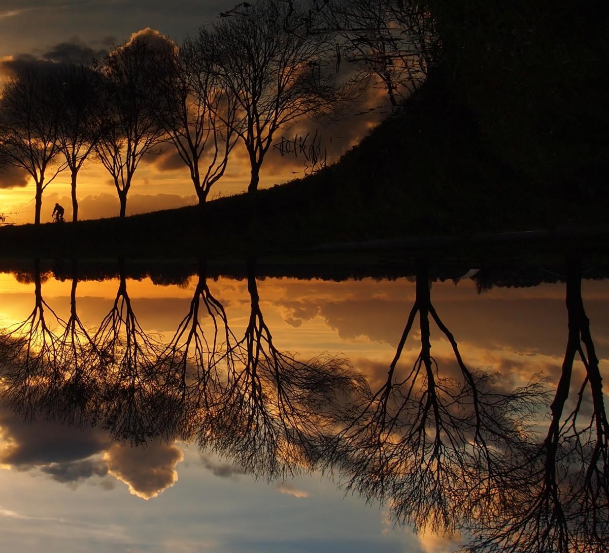 deze foto van de zonsondergang heb ik omgedraaid, omdat je alleen de fietser zag in de weerspiegeling van het water