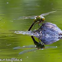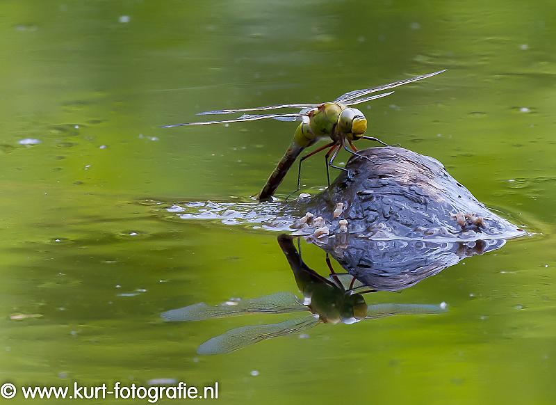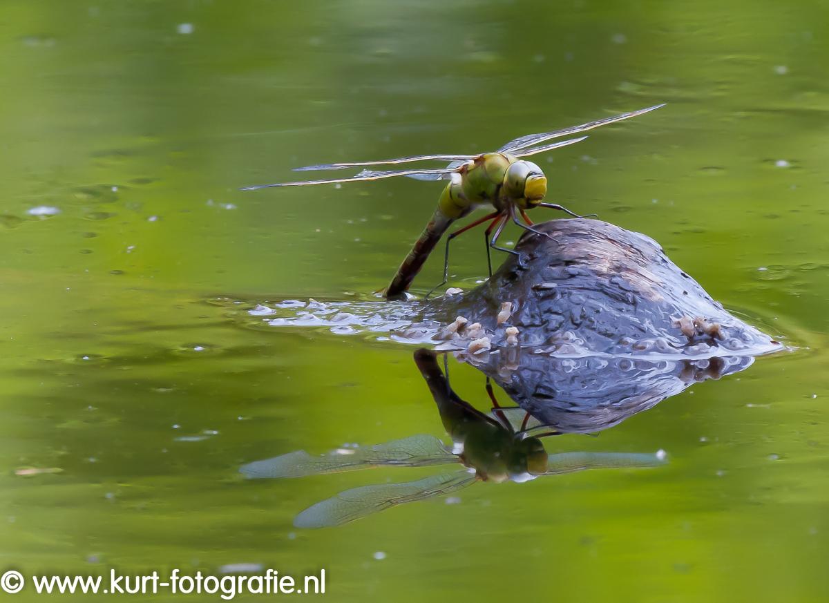 Een blauwe glazenmaker druk bezig met eitjes leggen op een boven het water uitstekend stukje hout. Na het nemen van deze foto begon ik met inpakken, net op het moment dat een eend kwam aanzwemmen en deze blauwe glazenmaker tot lunch maakte..., en miste daardoor het shot van "leven geven en dood"...