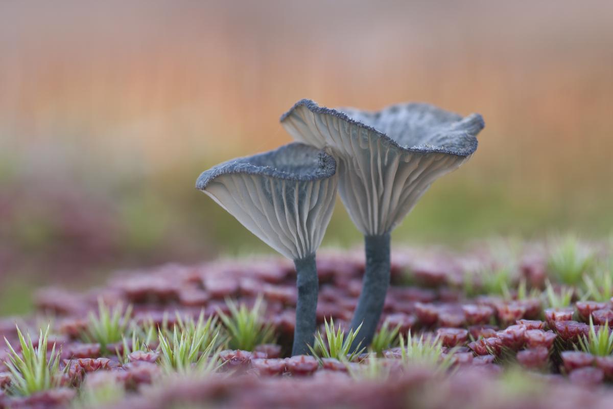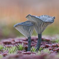 Blauwgroene trechterzwammetjes tussen mosjes.....