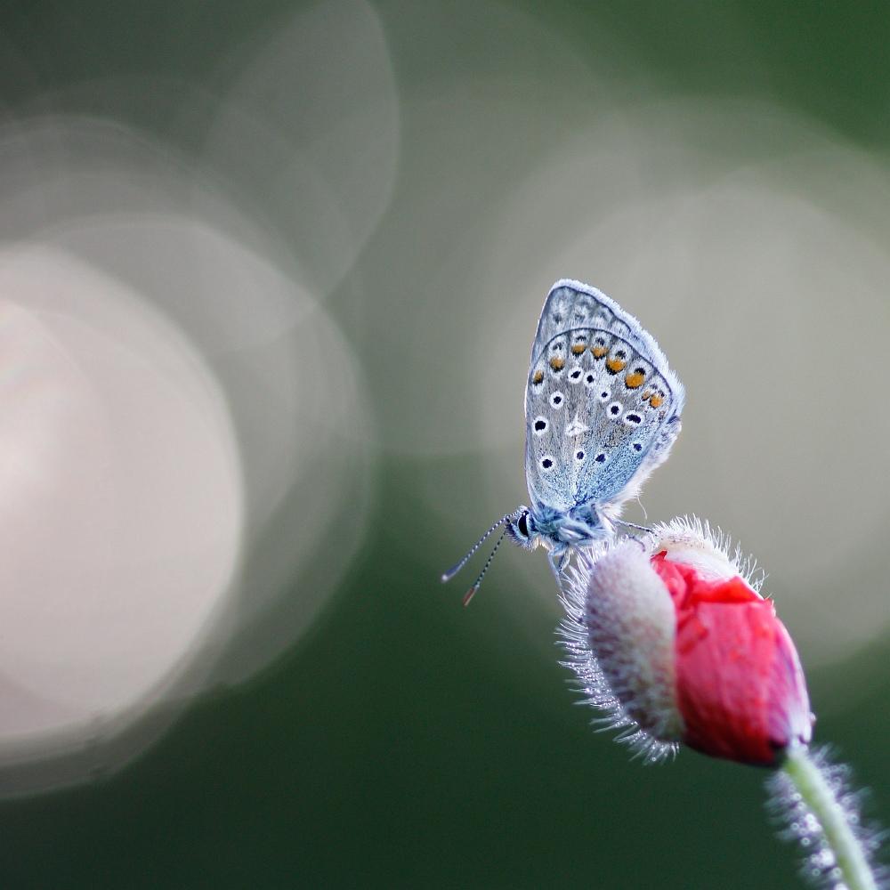 Een blauwtje op de knop van een klaproos.