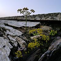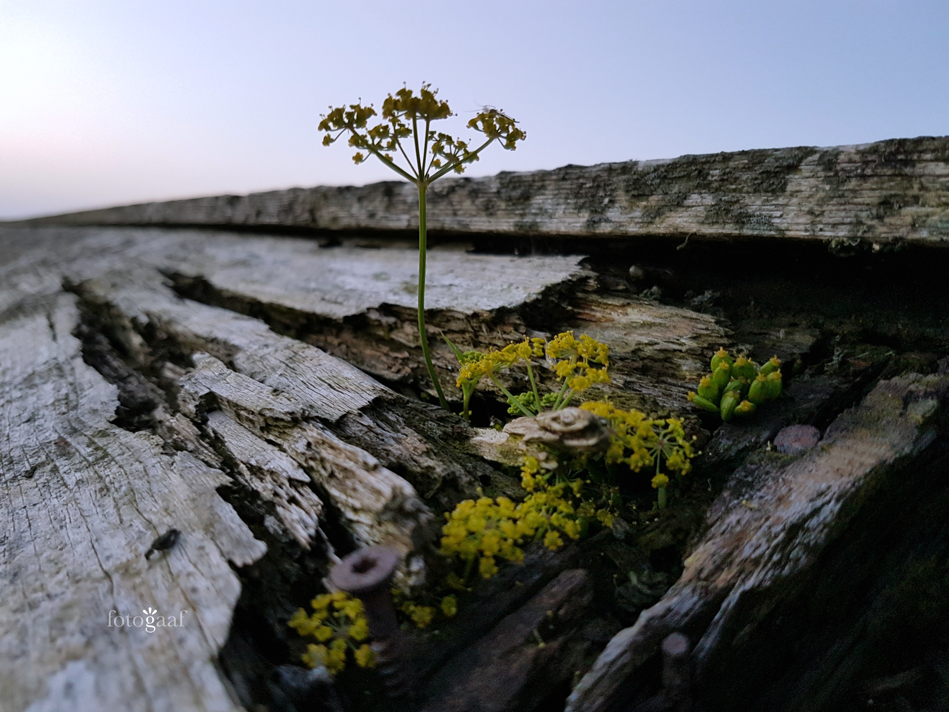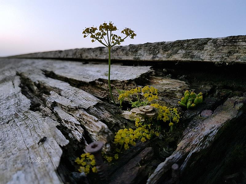 Dit is een closeup van het dak van het huisje, het half vergane hout is een welkome voedingsbodem voor deze plantjes die het grijze hout mooi geel versieren.