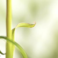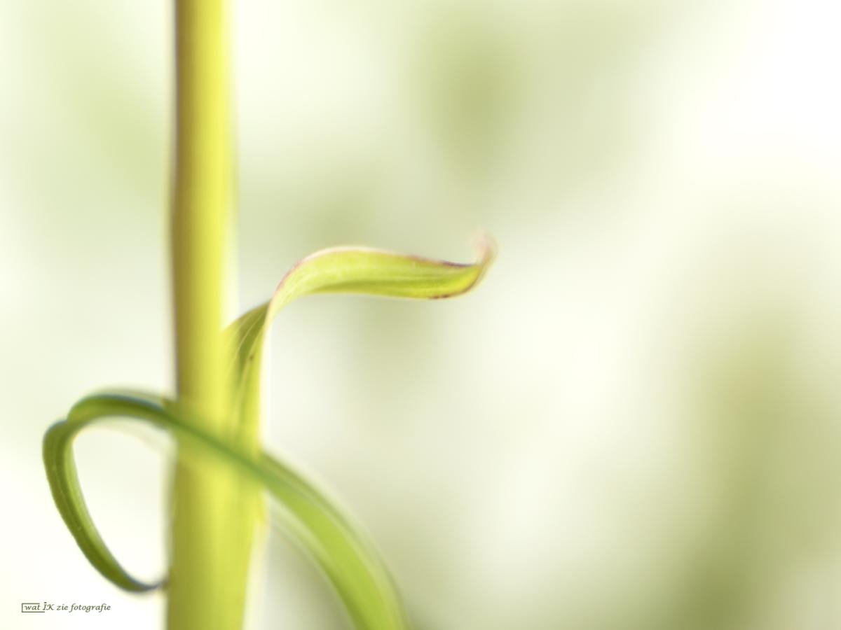 Een bloemstengeltje met een blad.....wat vage vlekken in de achtergrond van andere blaadjes/stengeltjes...….ik vond het beeld interessant en mooi genoeg om een foto van te maken.....