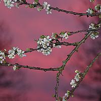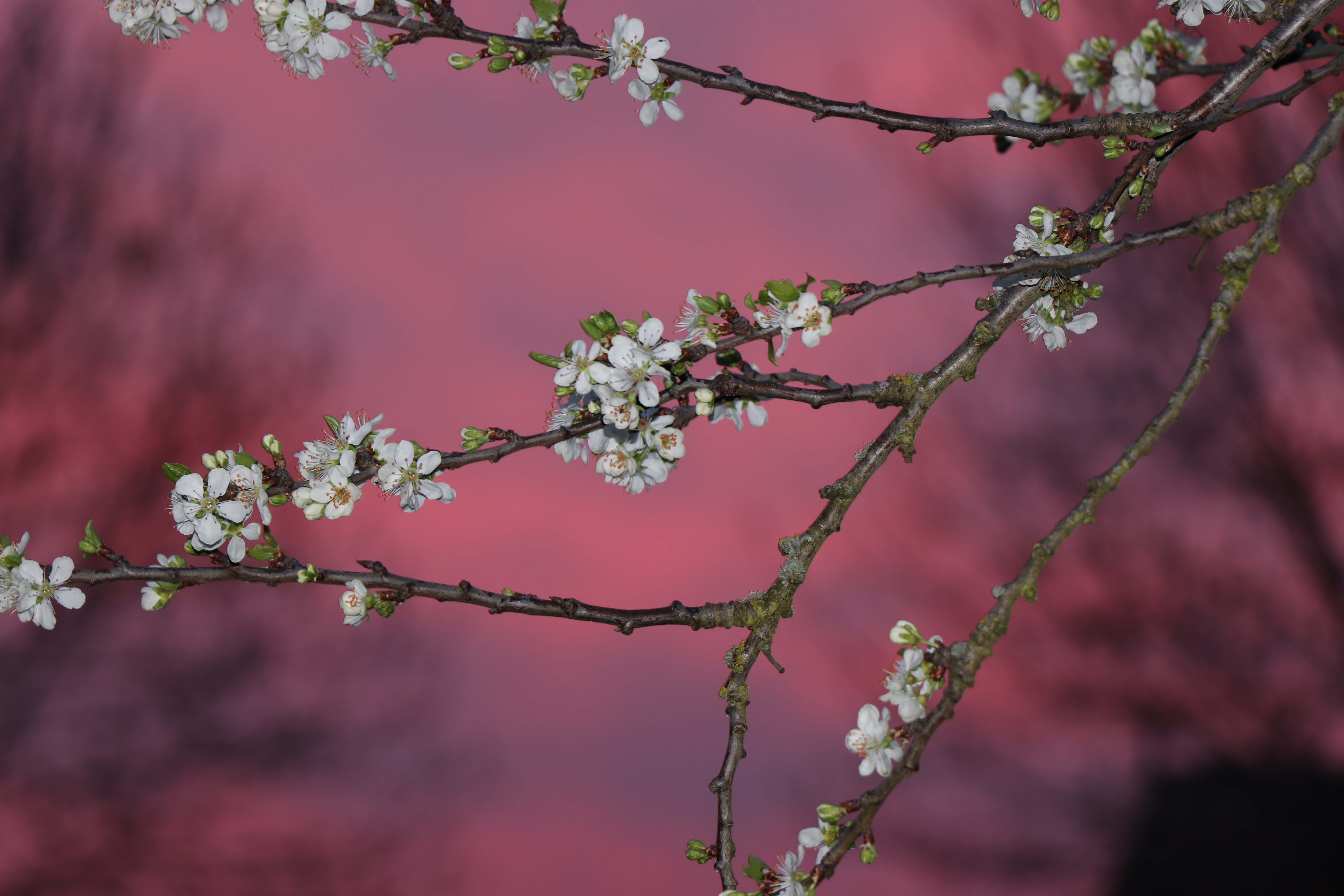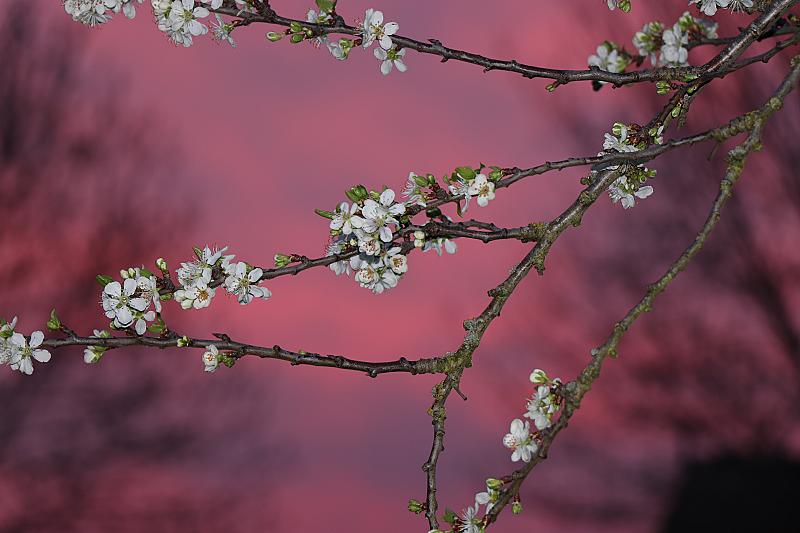 De ondergaande zon in allerlei mooie kleuren als achtergrond voor bloesem.