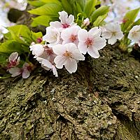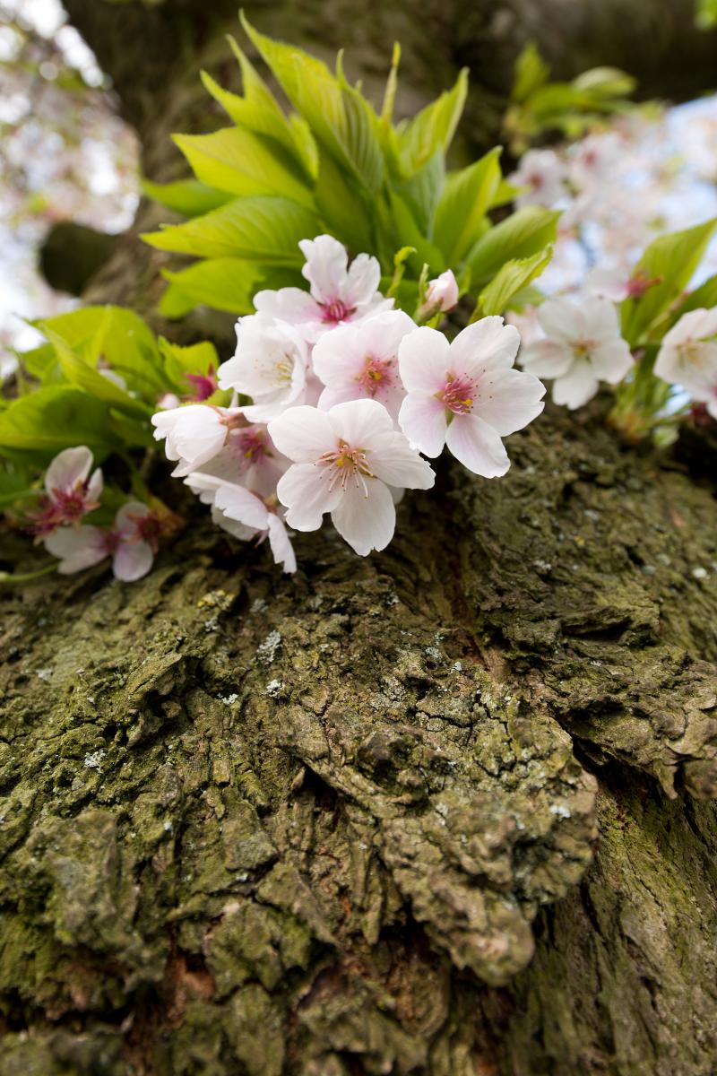 Een bloesemboom zit altijd vol aan alle takken, maar ook op de robuuste stam groeit de bloesem.