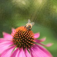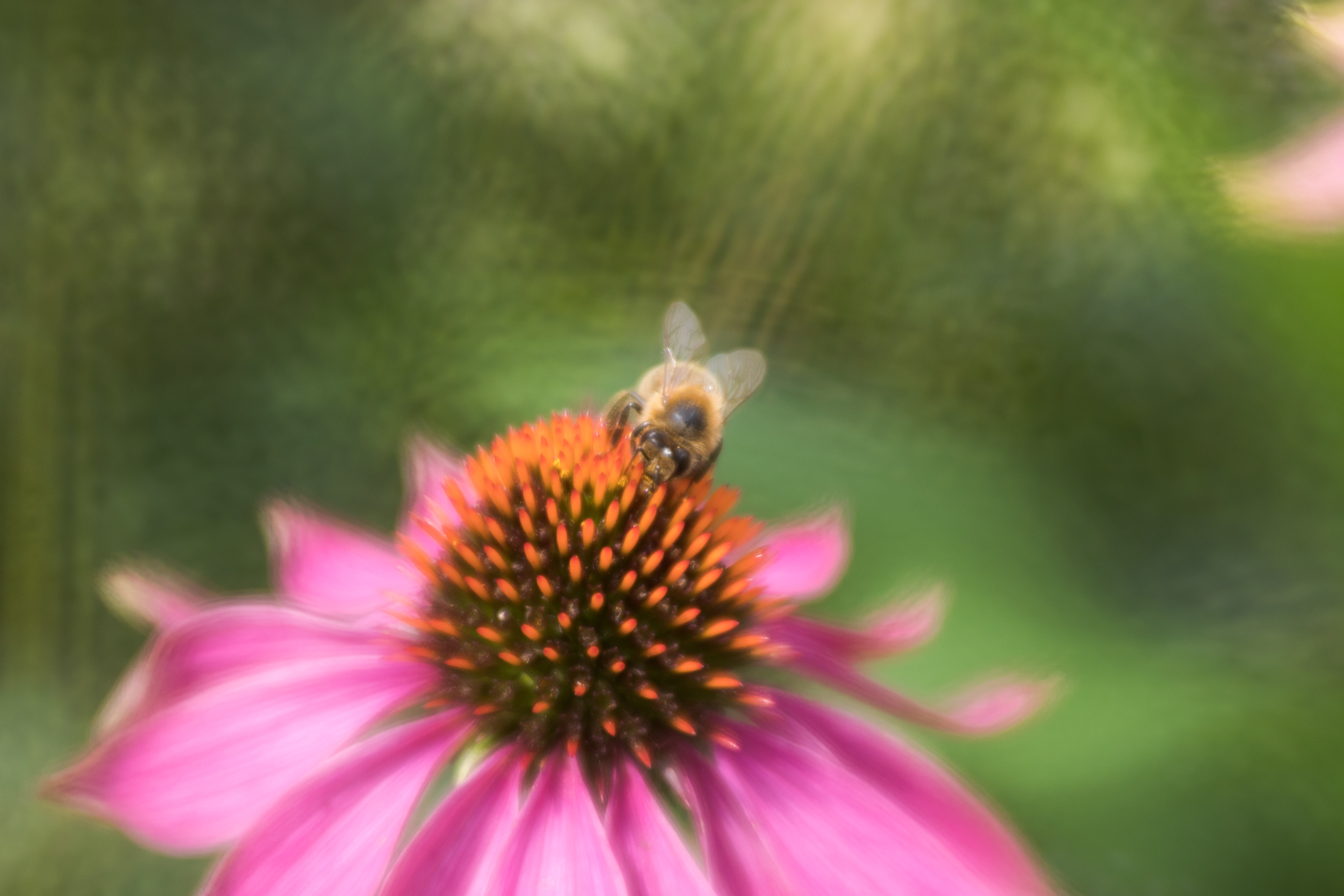 De echniacea met een bij, druk aan het werk. Foto gemaakt met de lensbaby composer pro en de double glas optic met macro ring. In de achtergrond zie je figuurtjes, dit is van het creatieve plaatje wat mijn diafragma was.
