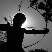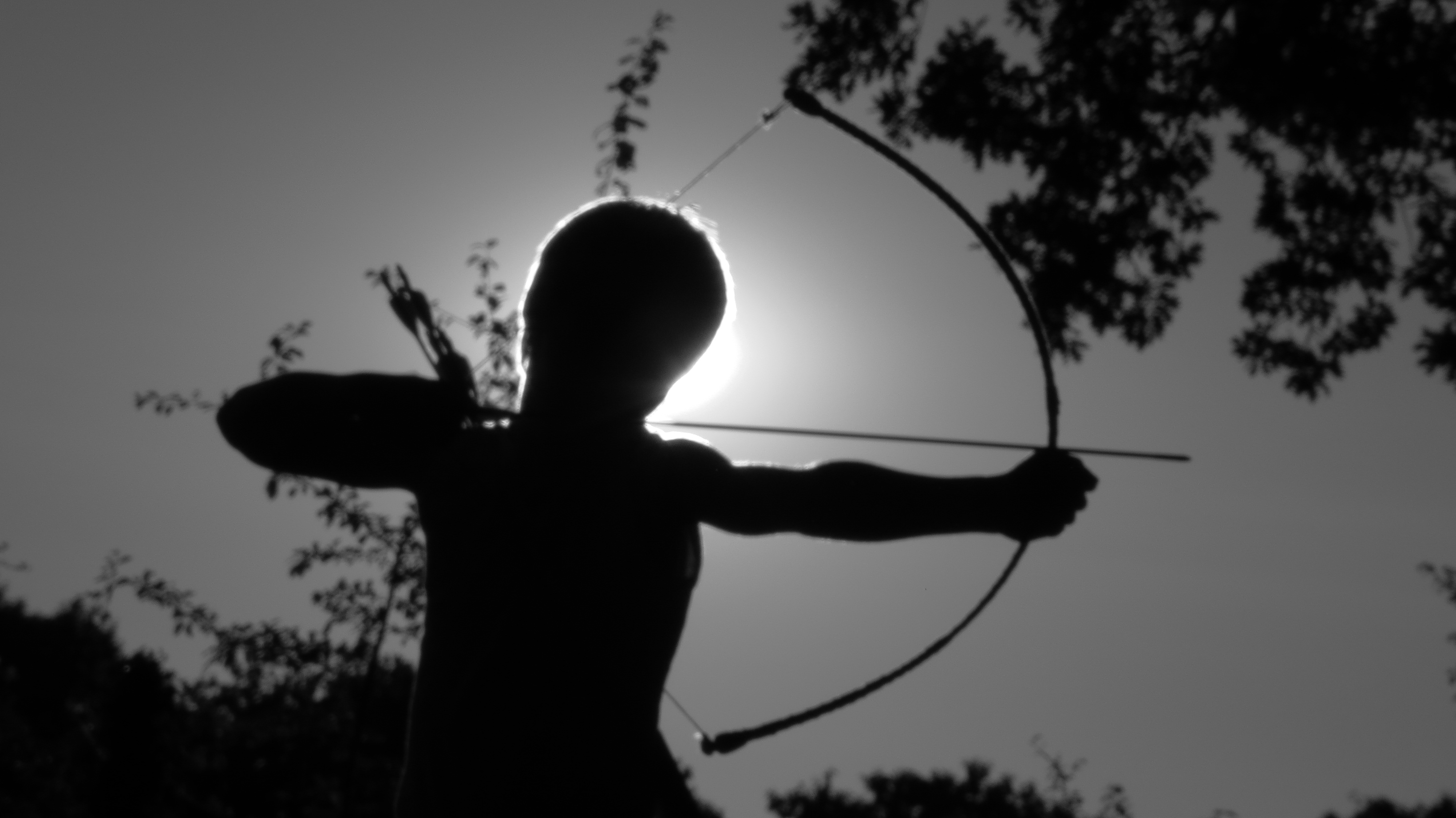 Mijn zoon op vakantie in Frankrijk, spelend met zijn pijl en boog bij een ondergaande zon.