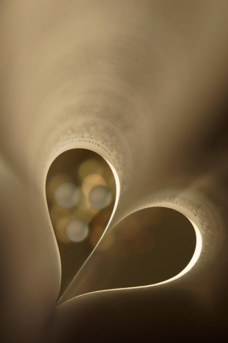 Macro opname van een boek , bladzijde in de vorm van een hart en daar doorheen Bokeh op de achtergrond.