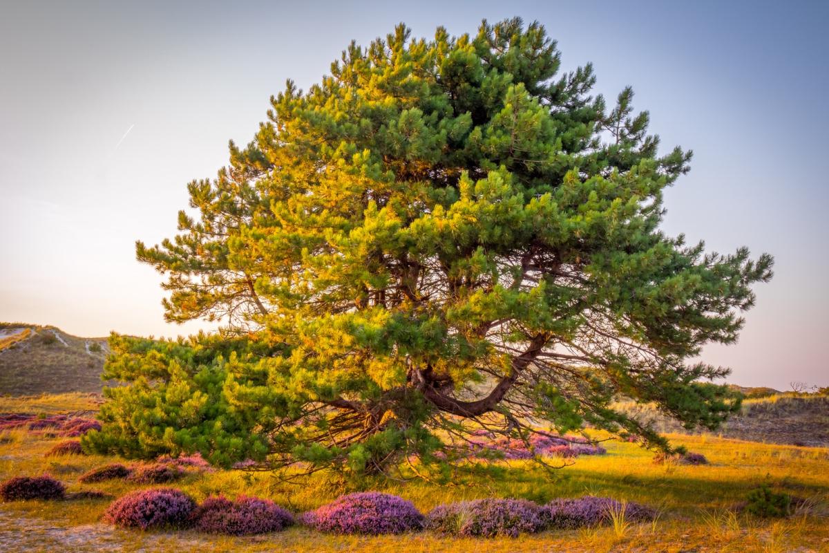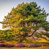 Boom omringd door heide