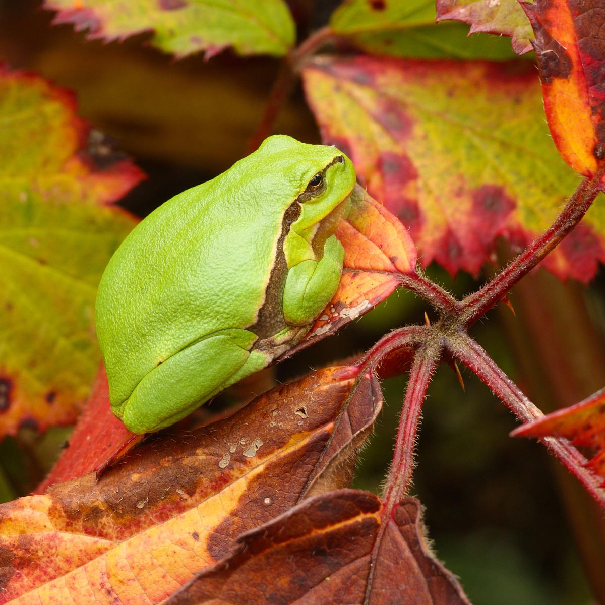 Boomkikker in natuurlijke biotoop (braamstruik) in herfstkleuren.