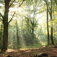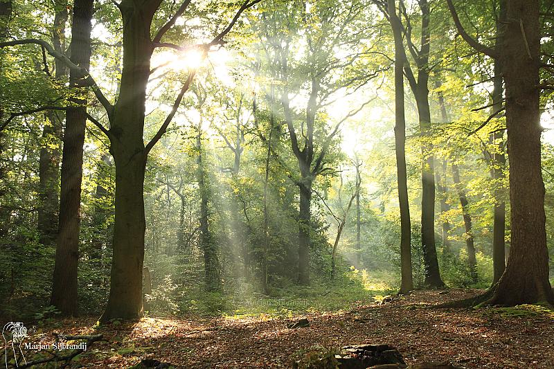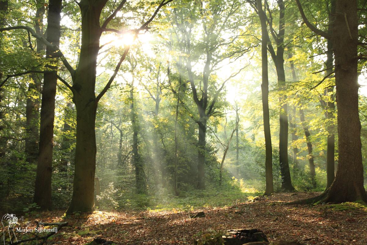 Heerlijk ochtend wandeling in het bos, genoten van de zon door de herfstbladeren.