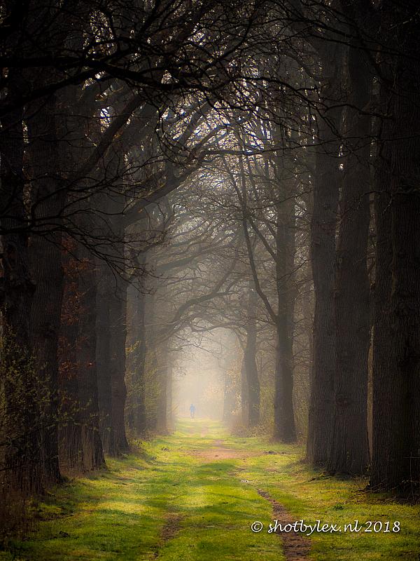 Eigenlijk was ik op zoek naar vlindertjes maar toen ik op de terugweg over mijn schouder keek werd ik aangenaam verrast! Met de telelens deze landschapsopname gemaakt, omdat die lens de boel mooi in elkaar drukt en op deze manier zien je aan het einde van het pad nog net een vaag iemand met een blauwe jas.