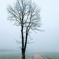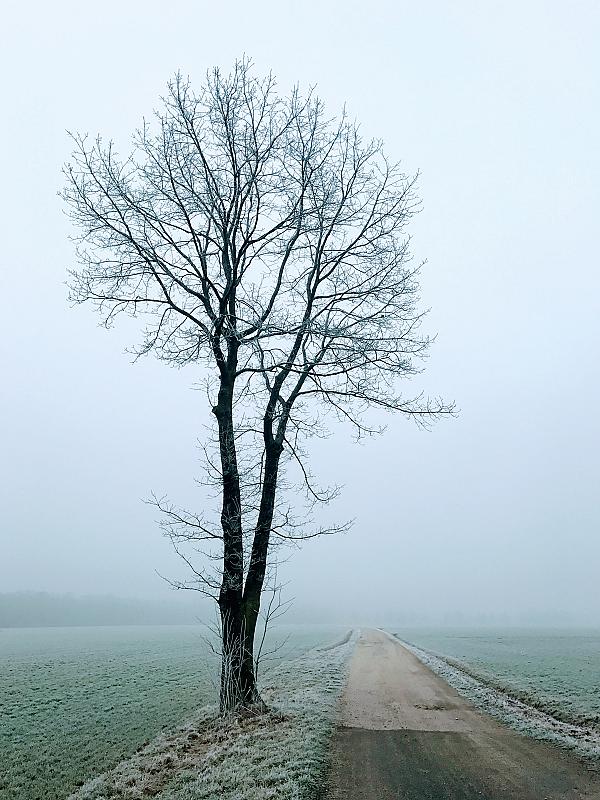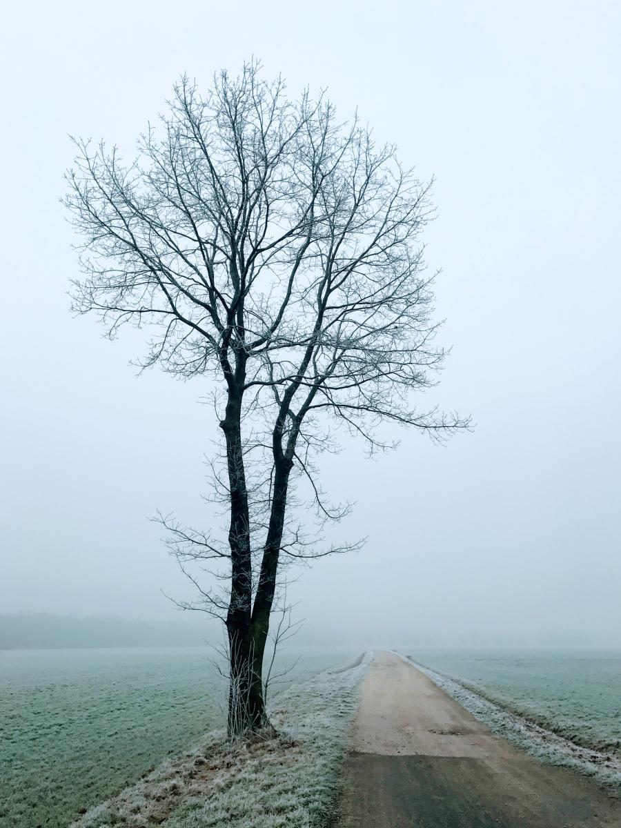 Een eenzame boom, op een koude en mistige, laatste dag van 2016 langs de weg naar het bos.
