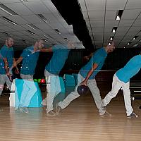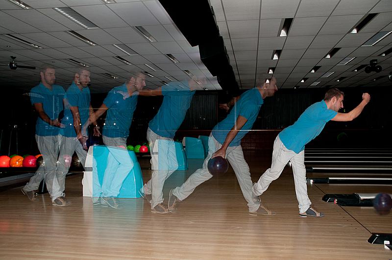 Met een, als stroboscoop ingestelde, flitser vastgelegde beweging van het uitspelen van een bowlingbal.