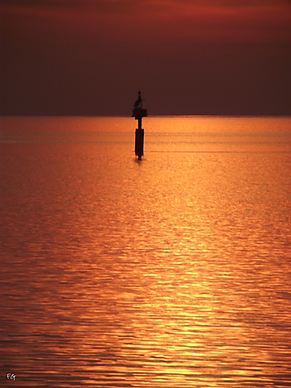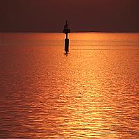 De lucht donkerrood, het water bronskleurig en de aalscholver op de boei krijgt een prachtig silhouet door het tegenlicht.